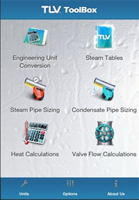Features of the new TLV ToolBox App include standard unit conversions; steam tables; steam pipe sizing (by velocity, flow rate and pressure loss); velocity and flow rates through a pipe; condensate pipe sizing; direct/indirect heat loads; continual/batch heat loads; a KV calculator, and flow rates through orifice or valve.