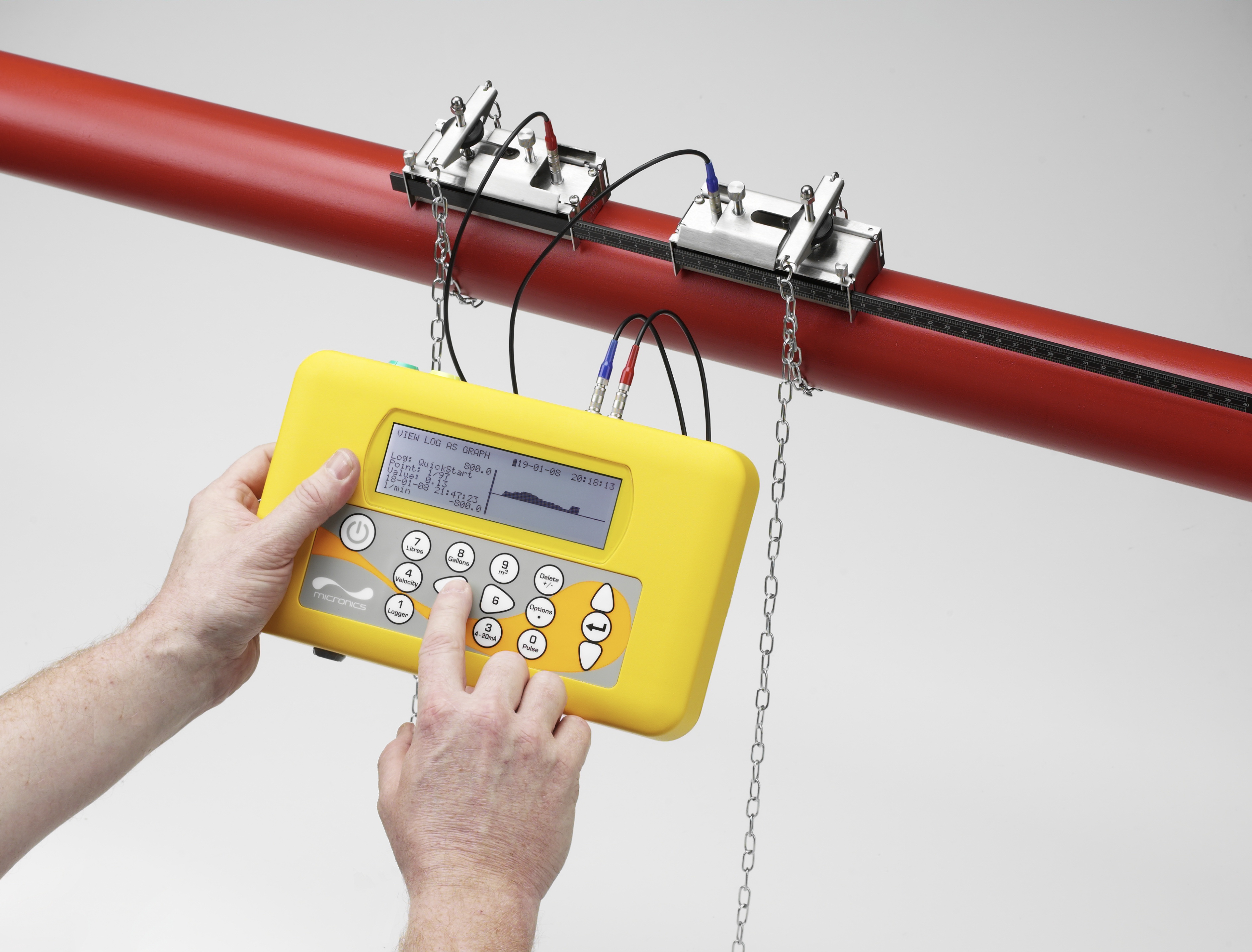 There is no simpler way than using one of Micronics Portaflow, Clamp-On range of portable Flow meters with integral loggers, which are acknowledged as the easiest to use in their class. Simple to apply and simple to use, a straightforward question and answer menu provides the facility to collect valuable information with the minimum of fuss or previous knowledge and minimum instruction. And when the information has been gathered it can be viewed on the instrument or downloaded for further analysis using industry standard formats.